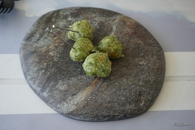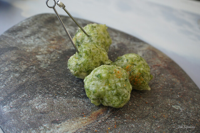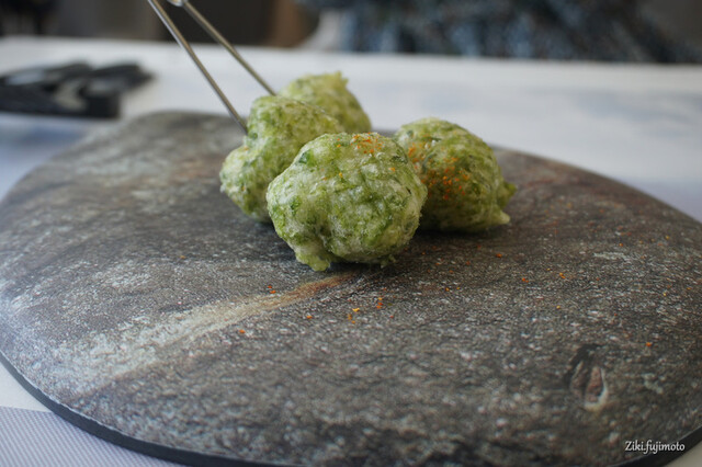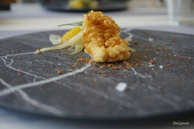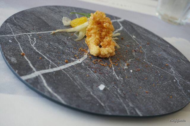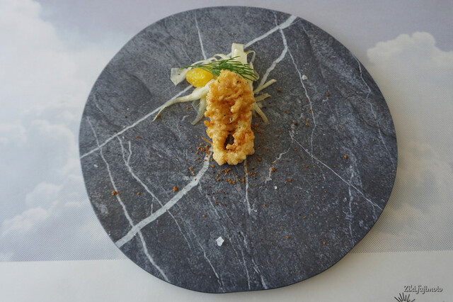 この料理は、初めていただいた。衣にもしっかりと味がついており、イカの旨味とカラスミの塩味の架け橋となっている。