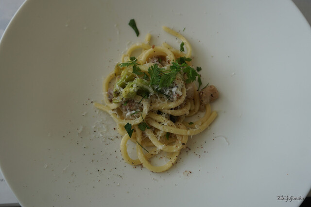 バジルのジェノベーゼを平麺の生パスタにて。このバジルペーストの出来が良く、お土産に瓶詰にして持ち帰りたいぐらいだった。