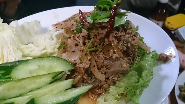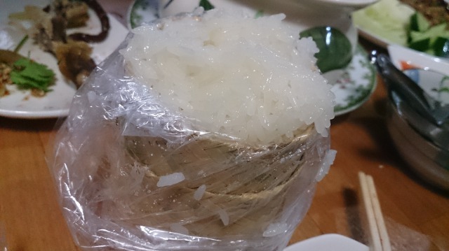 僕的に初体験だったのがこれ。もち米を竹籠に入れて蒸したもので、手で掴んで手でこねて団子みたいにして食べながらお肉とかを食べるわけ。なかなかいいもんです。新たな食文化を学べました。