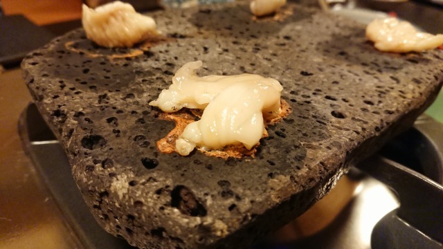 醤油系のタレにつけられた河豚の身と一緒に溶岩プレートが登場し、