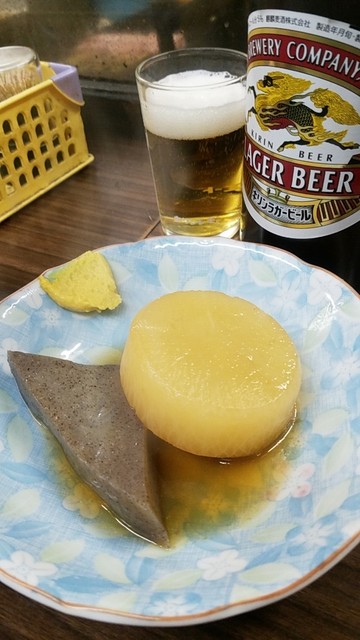 おでん(大根、こんにゃく)@100円×2とキリンラガー大瓶480円*すべて税別