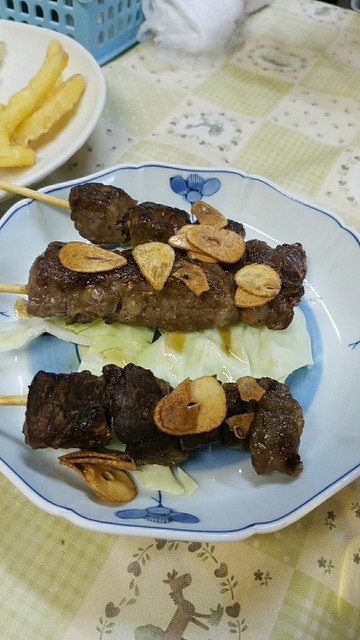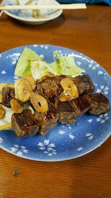 すじ焼はバラ肉を串刺しにして焼いた物だが、揚げにんにくの風味と塩加減がよく、これも旨い(≧▽≦)