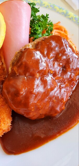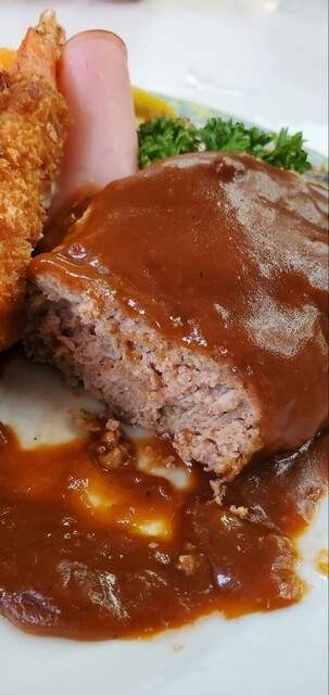 ナツメグの香るいかにも洋食屋のハンバーグでご飯が進むデミグラスソース味。