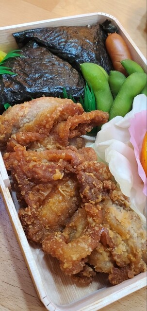 若鶏むすび(むすび2個、唐揚げ3個、ウインナー、枝豆、キャベツ、たくあん、オレンジ)