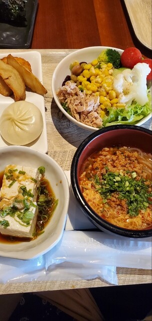 チキンナゲット、ポテトフライ、ミニ肉まん、冷や奴、野菜サラダ、宮崎辛麺