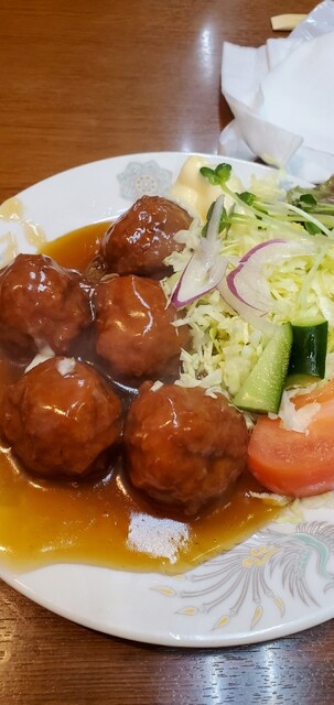 カラッと揚げられたミンチボールを甘めの甘酢餡で絡めた逸品。