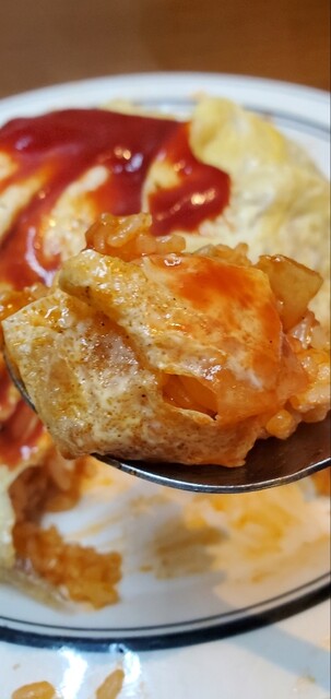 さっくりレンゲで割っていただくと、ケチャップの酸味と中華オム特有のこってり感が味わえる。