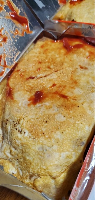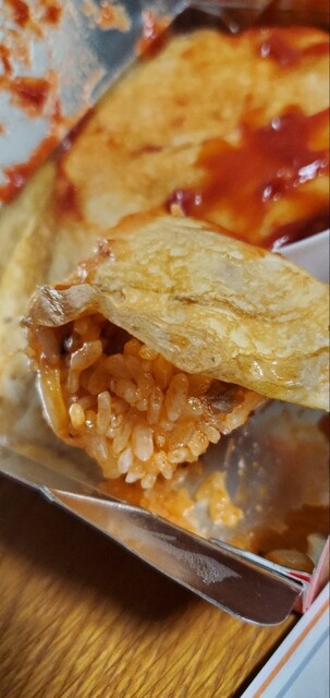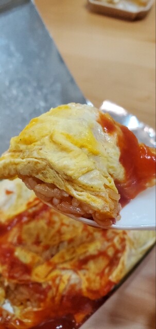 しっかり焼かれた玉子シートの中には豚肉入りのケチャップライス。