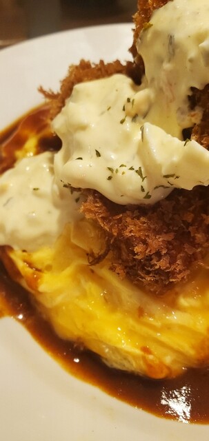 ドライカレーのオムライスの上にトマトソース、カキフライ3個にタルタルソースを添えたもの。