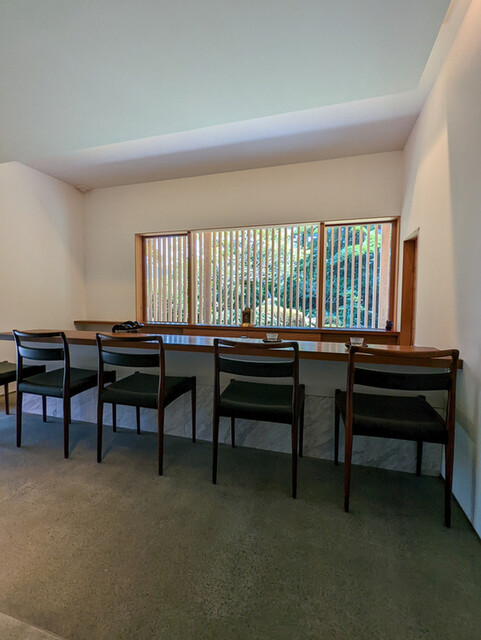 内観は扉を開けると予約30分前から入れる待合室があり、時間になると横にあるカウンター8席の空間へ移動。