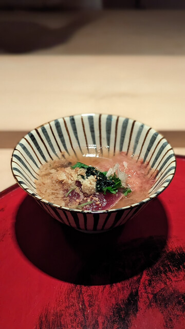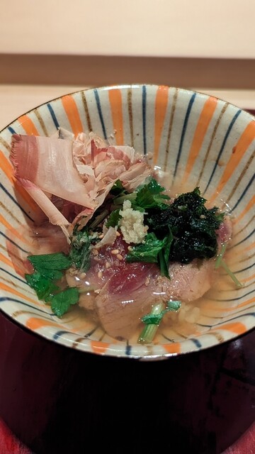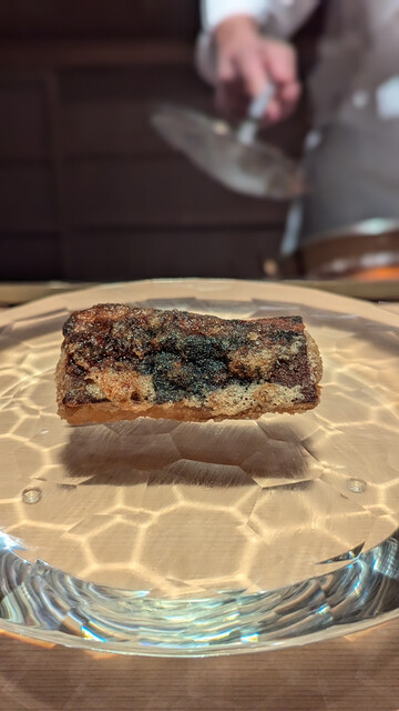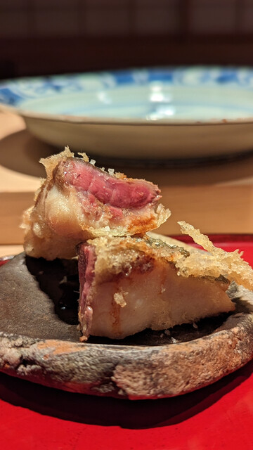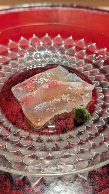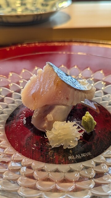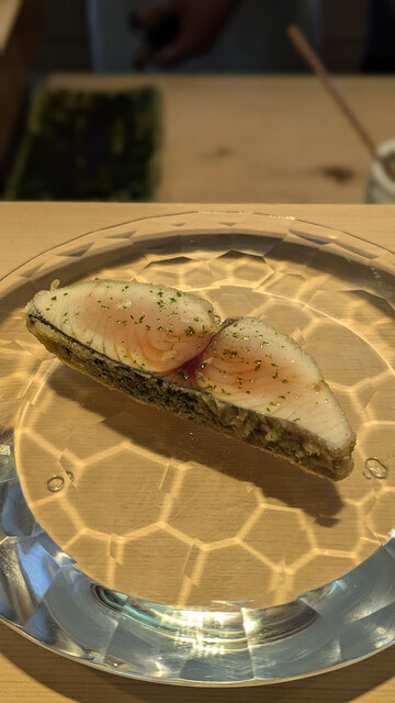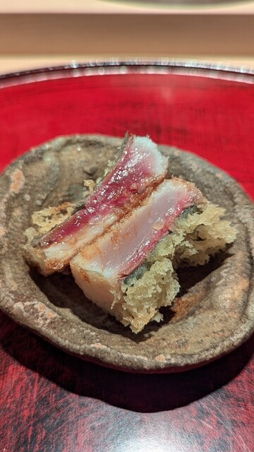 レアだけど中心まで火が通っているので温度高く口の中で味わいが広がる。凄く繊細な火入れにより旨みを出したたまらない鯵。背と腹で食感の違いを。