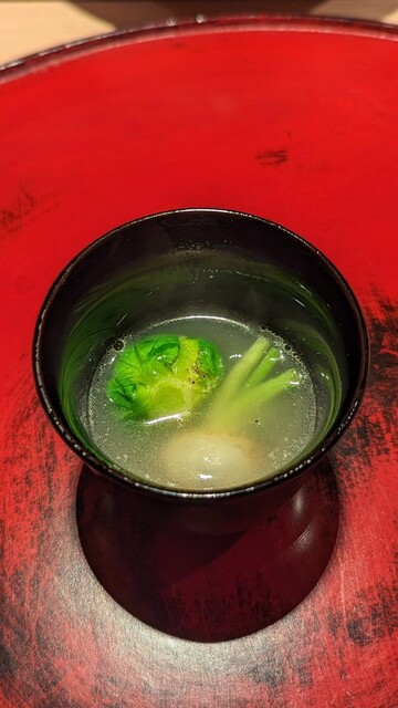 しっかり味わい深くコクのある九絵の出汁に低温火入れした蕪と芽キャベツがたまらない。