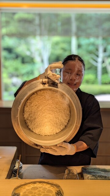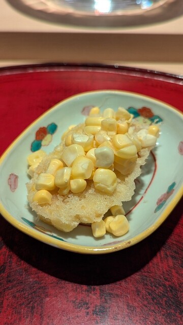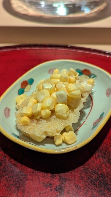 上には冷たい生玉蜀黍を乗せて。天ぷらの甘みとフレッシュな食感の組み合わせがたまらない。こちらも感動的だった。