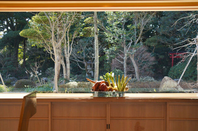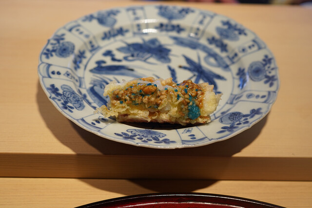 以前のお店では野菜の天ぷらが評判だった成生、駅前の小さい店舗だったのが東雲神社のとなり、緑豊かな場所に引っ越した。以前のお店は行っていたが、新しいお店になってからは予約を取る事ができてなく、ようやくお誘いを受け行くことができた。お店につくとまずはウエイティングスペースに案内されお茶を振舞われる、このお部屋だけで贅沢な空間だ。用意ができると、カウンター8席のお部屋に案内される。