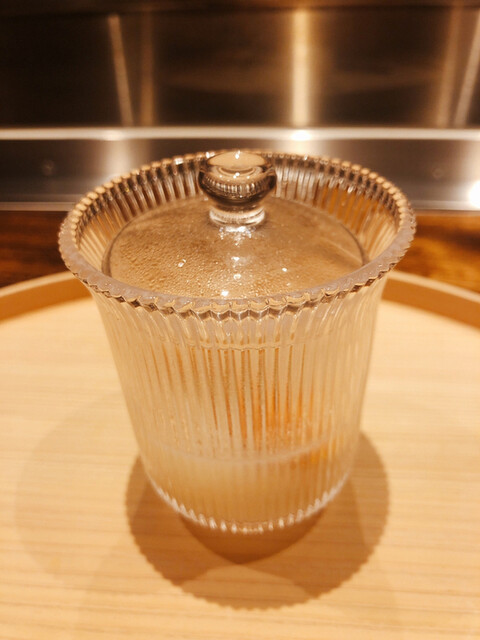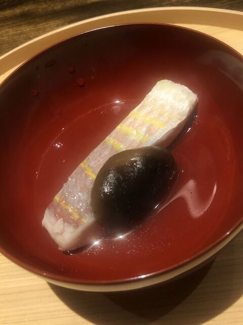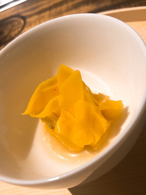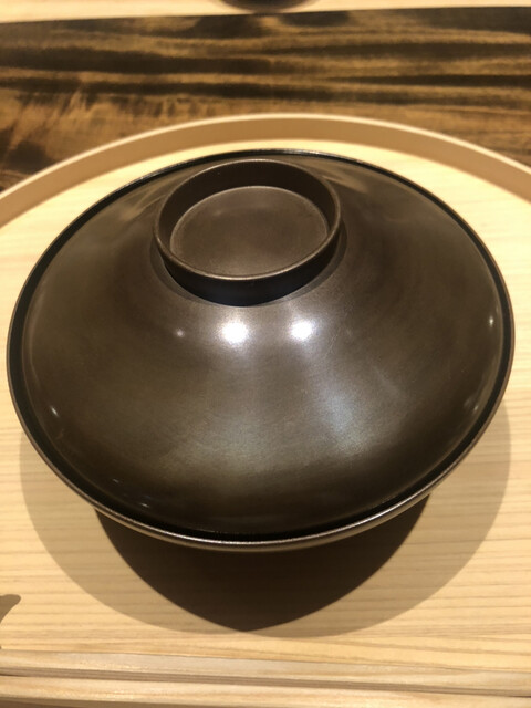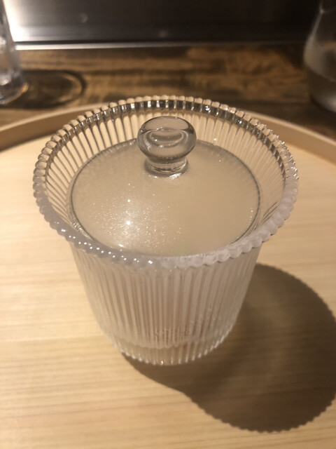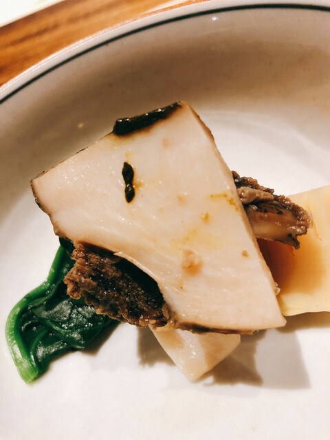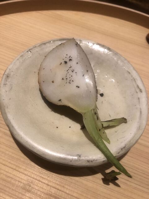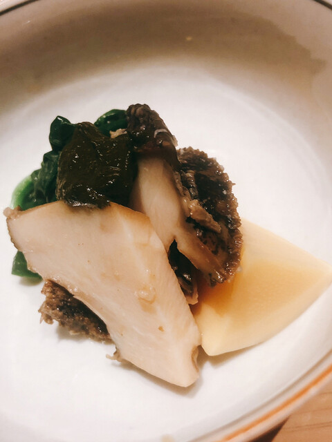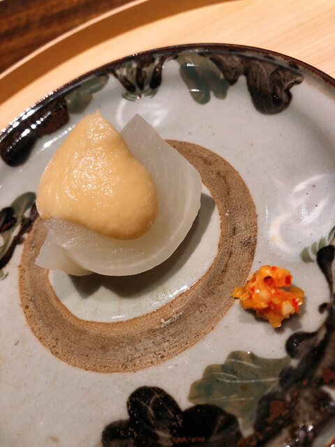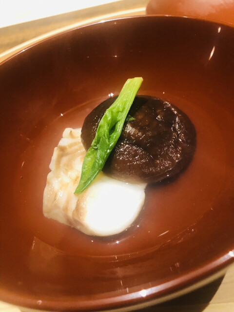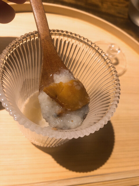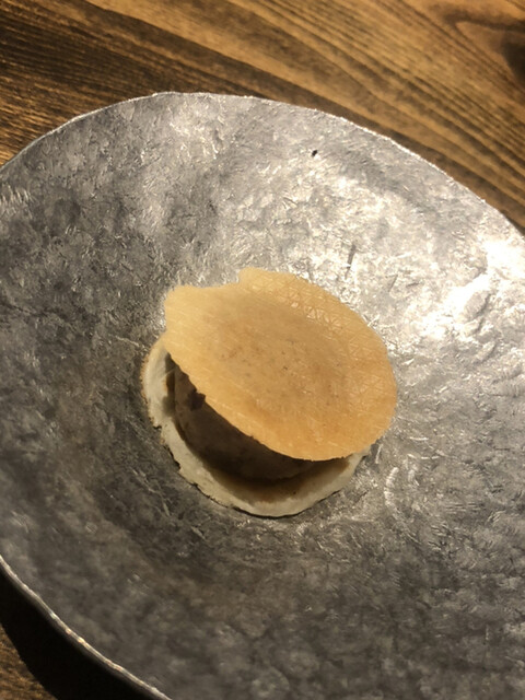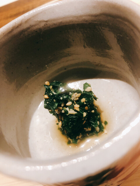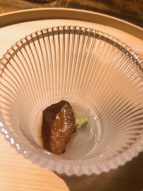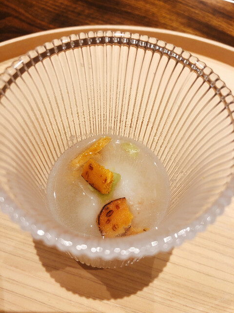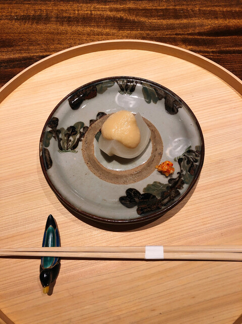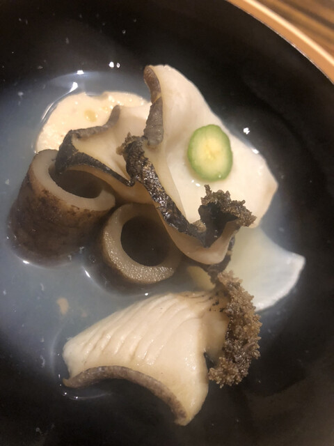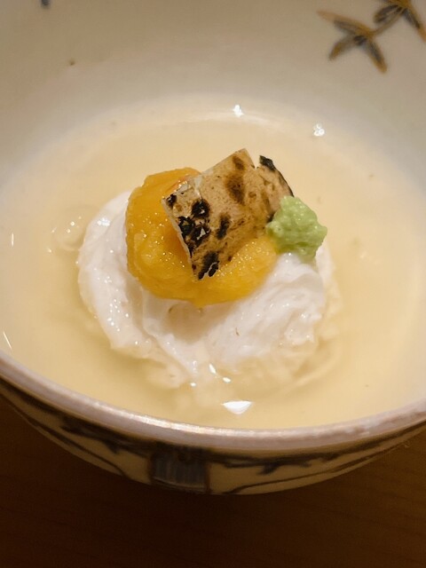静岡県の奥山から届いた自然薯を卵白とともに蒸して、生唐墨の塩味でいただきます。でもそれだけでは有りません。その自然薯の皮を炭火で焼いて、深山の土の香りを添加しました。お出汁の旨味が静かに寄り添い、ワガママな舌も胃も歓喜の波に飲み込まれました。完全無比のスターターです。