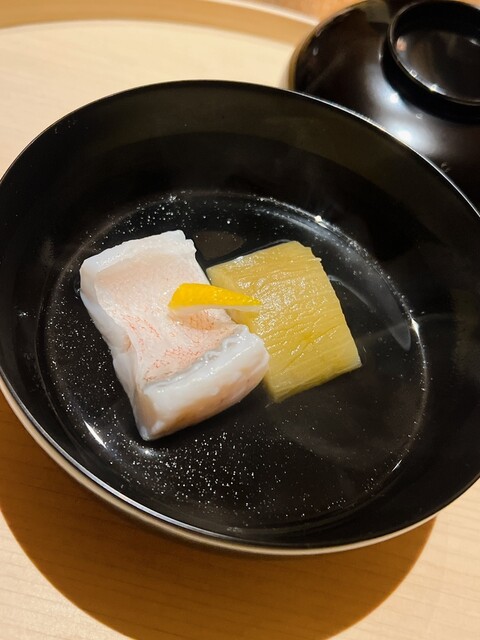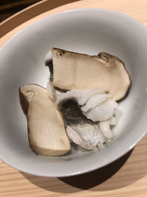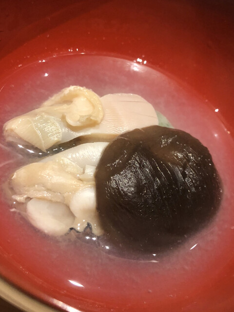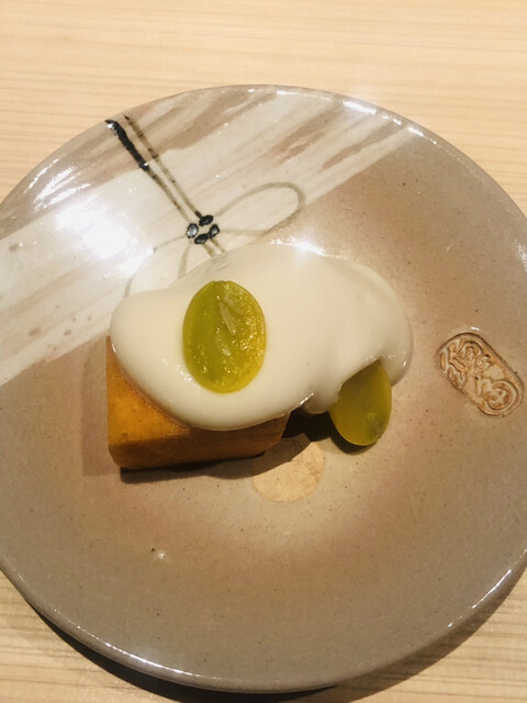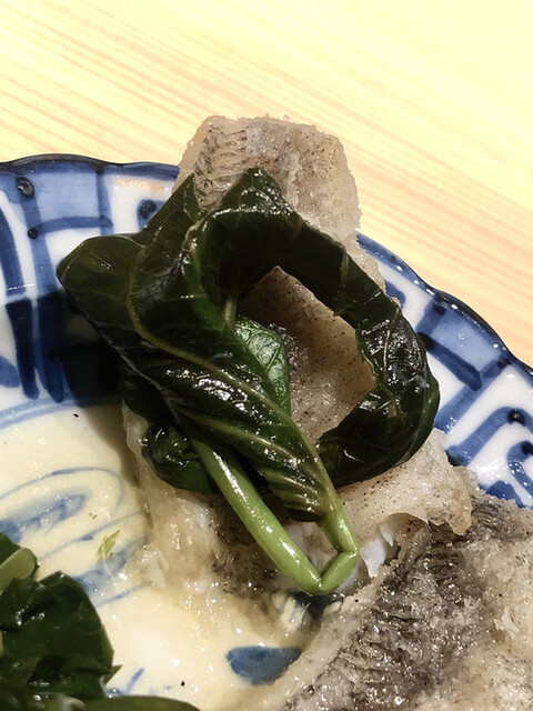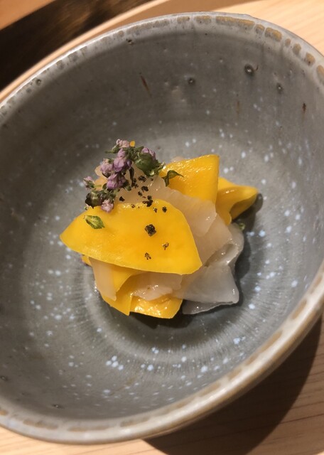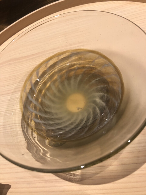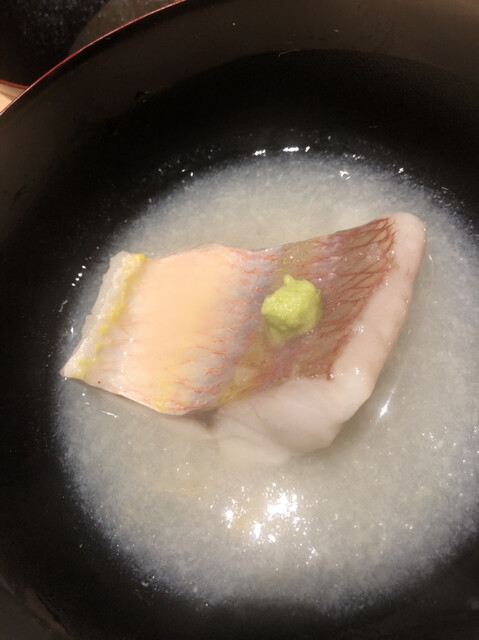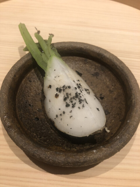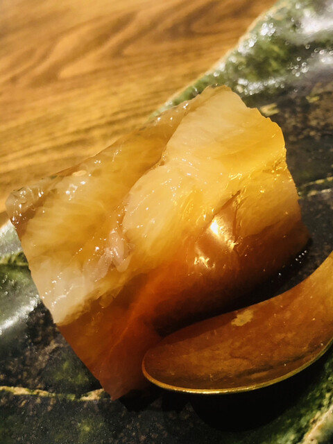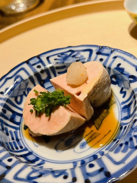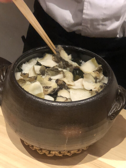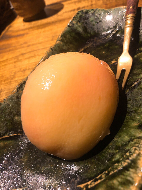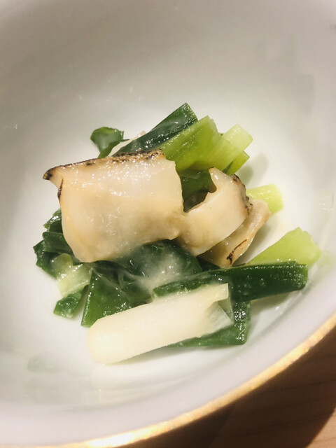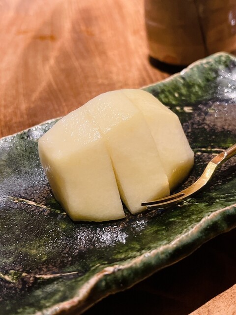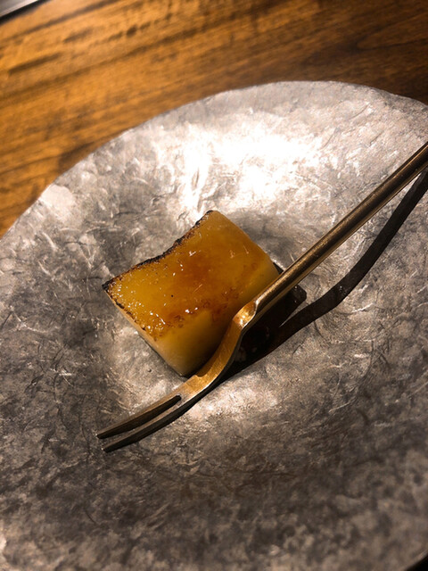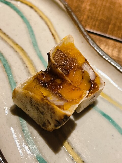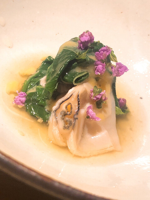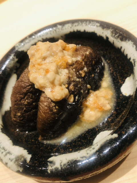 静岡県の奥山から届いた自然薯を卵白とともに蒸して、生唐墨の塩味でいただきます。でもそれだけでは有りません。その自然薯の皮を炭火で焼いて、深山の土の香りを添加しました。お出汁の旨味が静かに寄り添い、ワガママな舌も胃も歓喜の波に飲み込まれました。完全無比のスターターです。