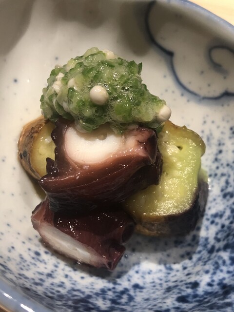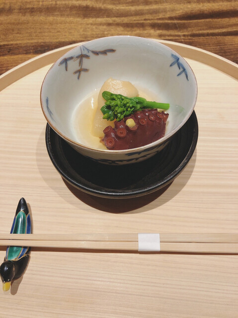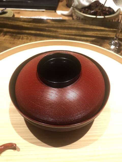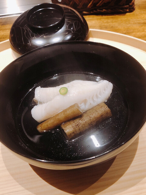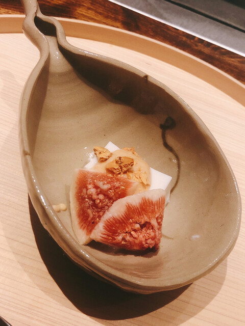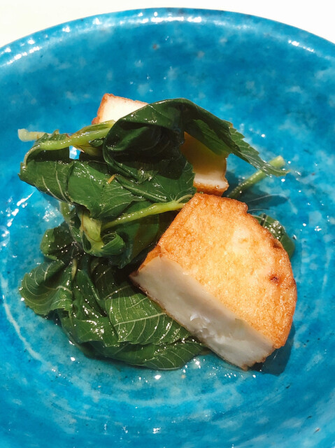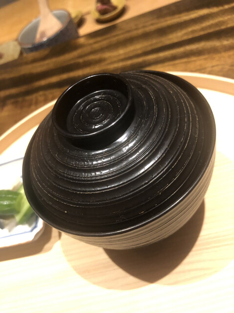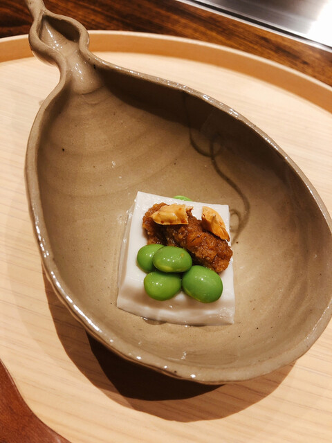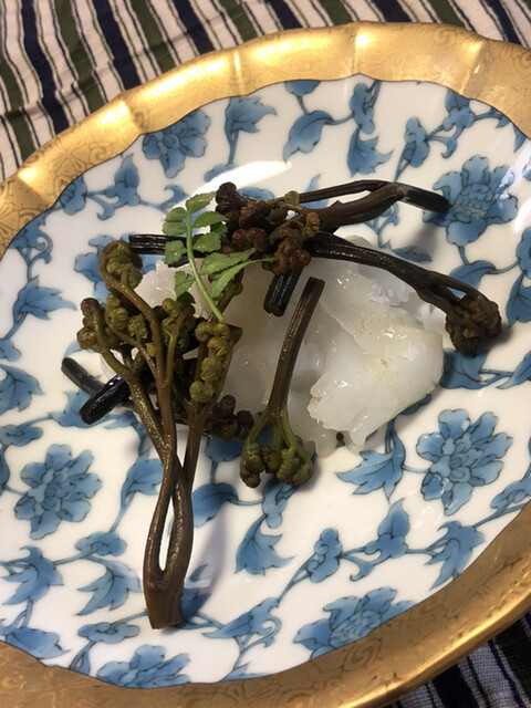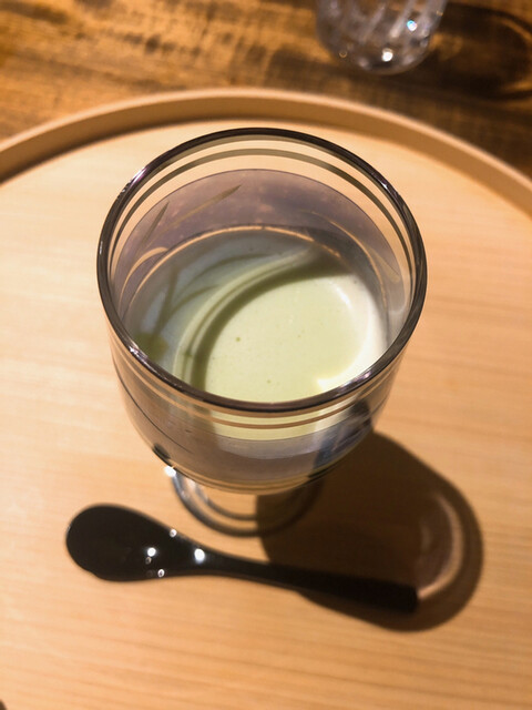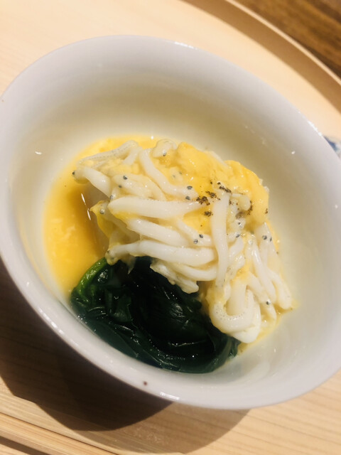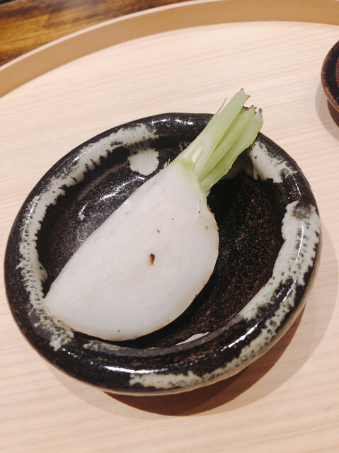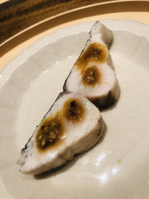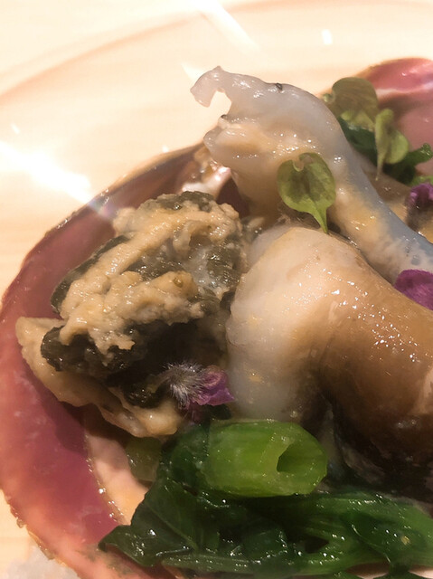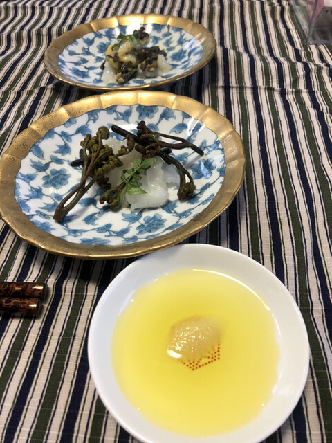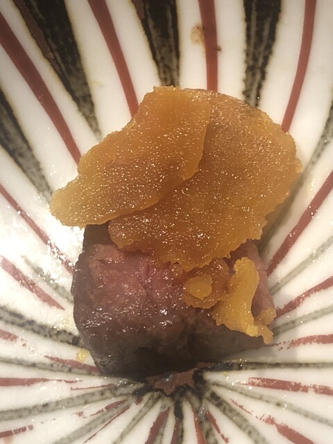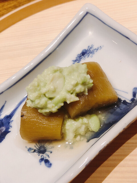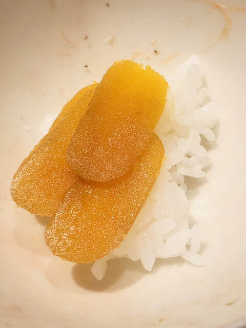 静岡県の奥山から届いた自然薯を卵白とともに蒸して、生唐墨の塩味でいただきます。でもそれだけでは有りません。その自然薯の皮を炭火で焼いて、深山の土の香りを添加しました。お出汁の旨味が静かに寄り添い、ワガママな舌も胃も歓喜の波に飲み込まれました。完全無比のスターターです。