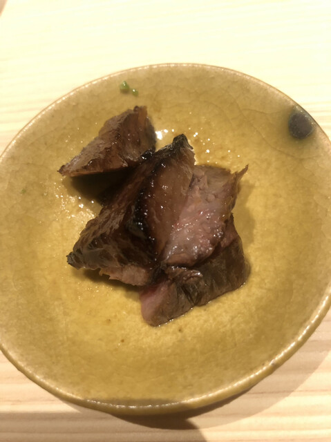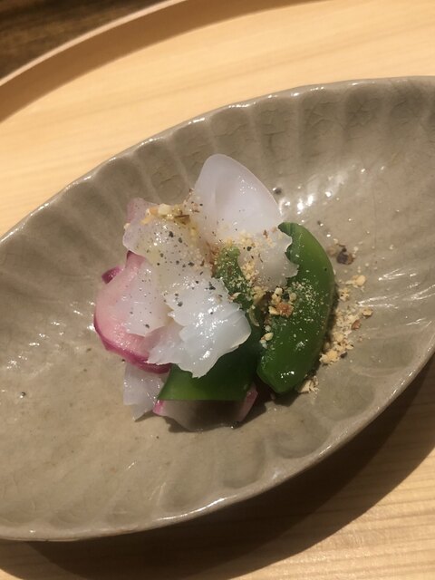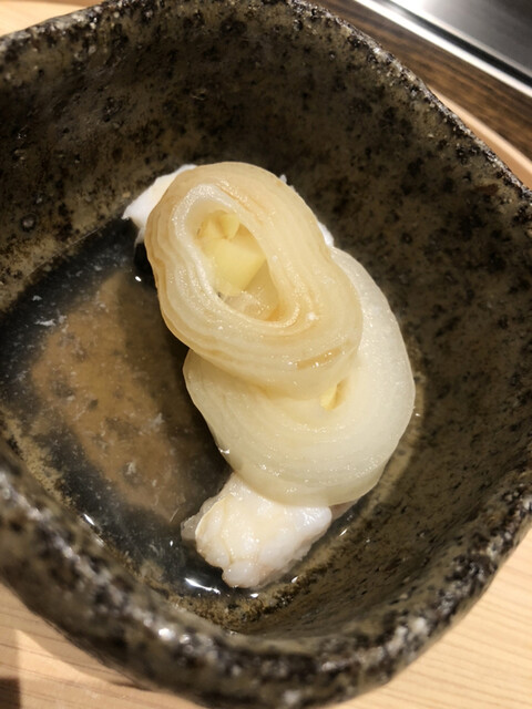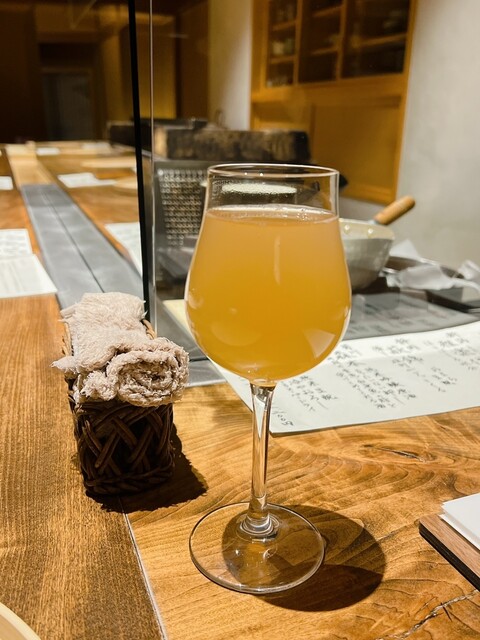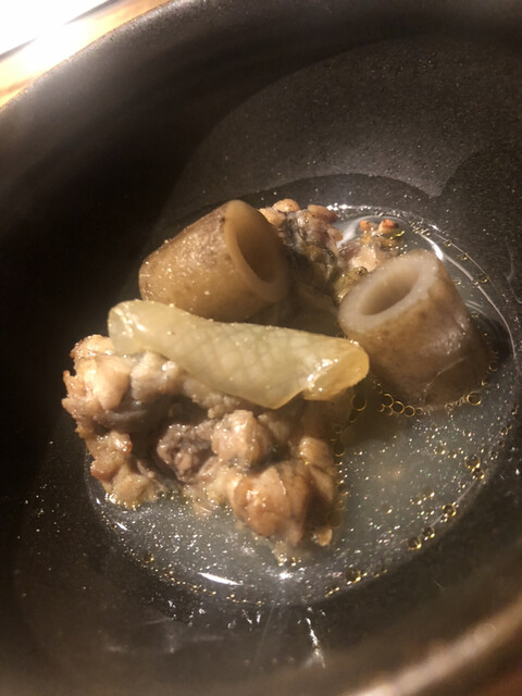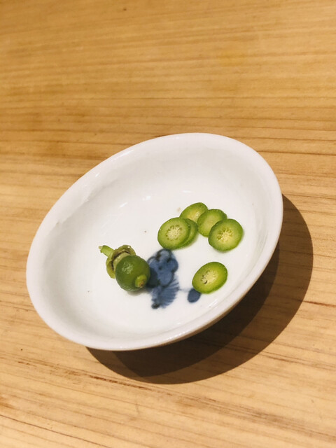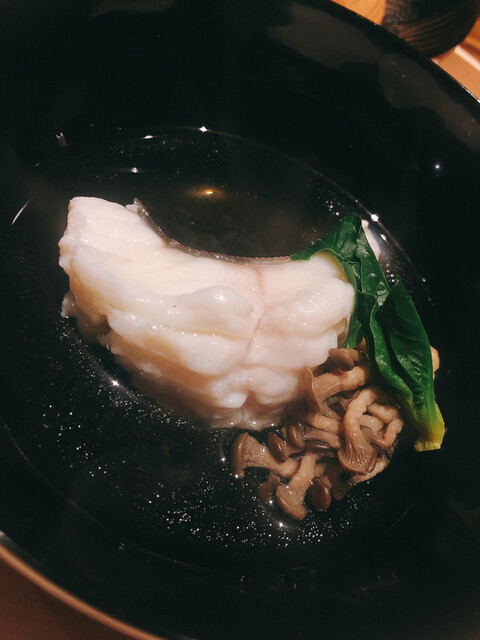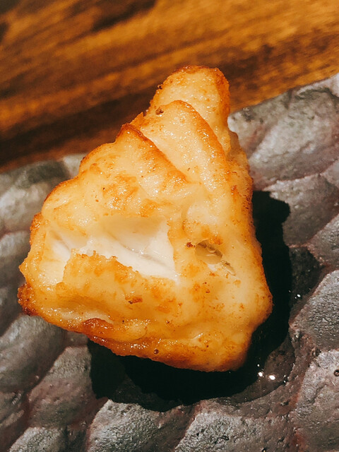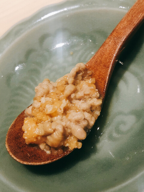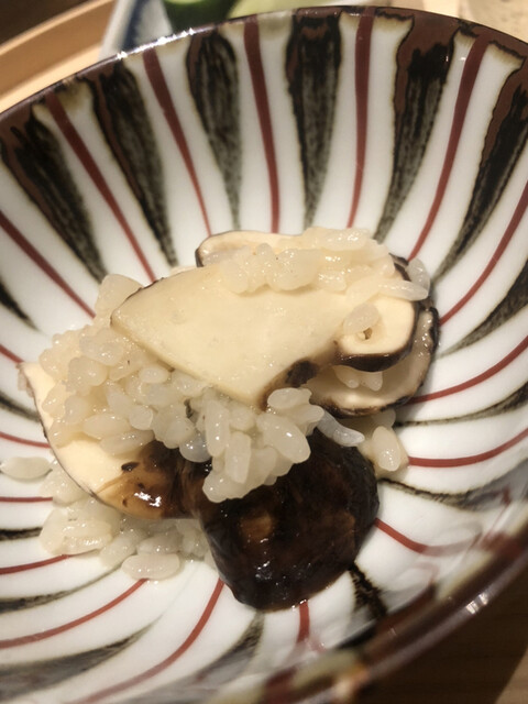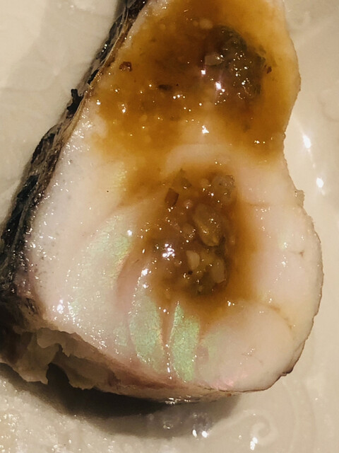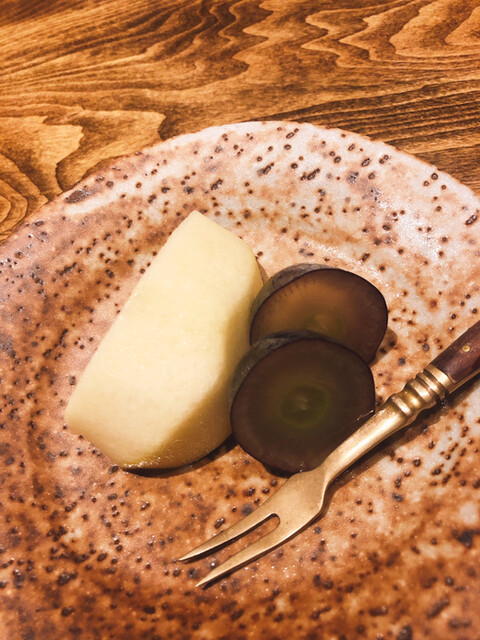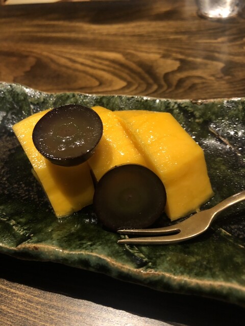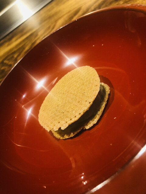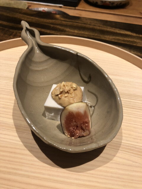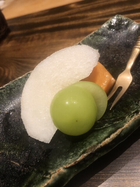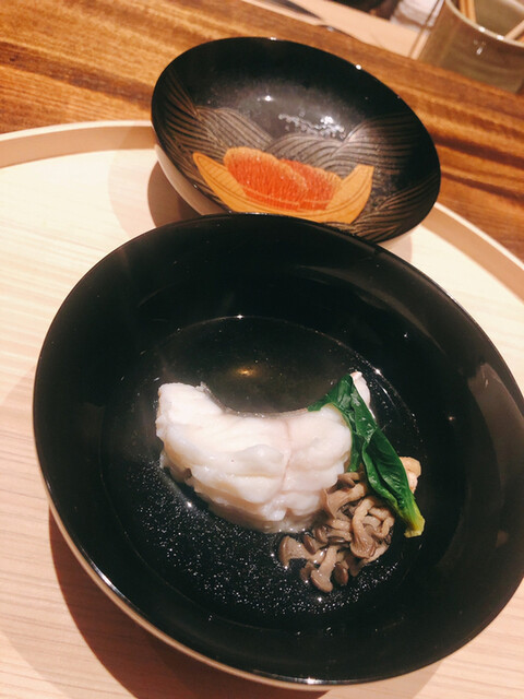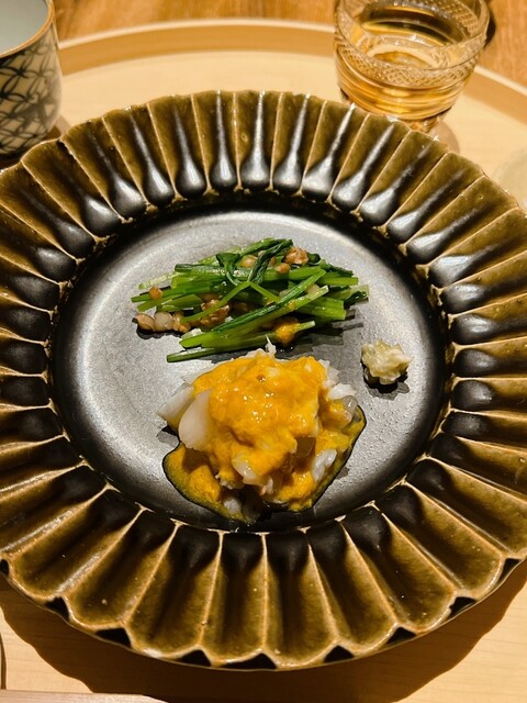 静岡県の奥山から届いた自然薯を卵白とともに蒸して、生唐墨の塩味でいただきます。でもそれだけでは有りません。その自然薯の皮を炭火で焼いて、深山の土の香りを添加しました。お出汁の旨味が静かに寄り添い、ワガママな舌も胃も歓喜の波に飲み込まれました。完全無比のスターターです。