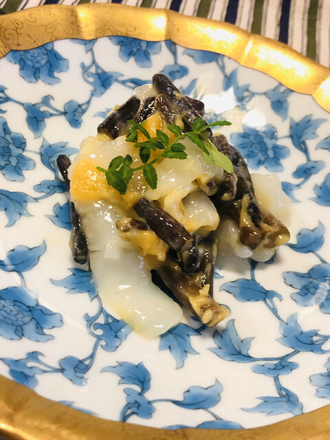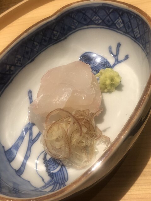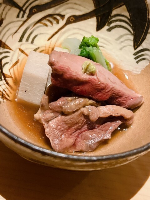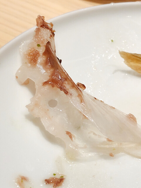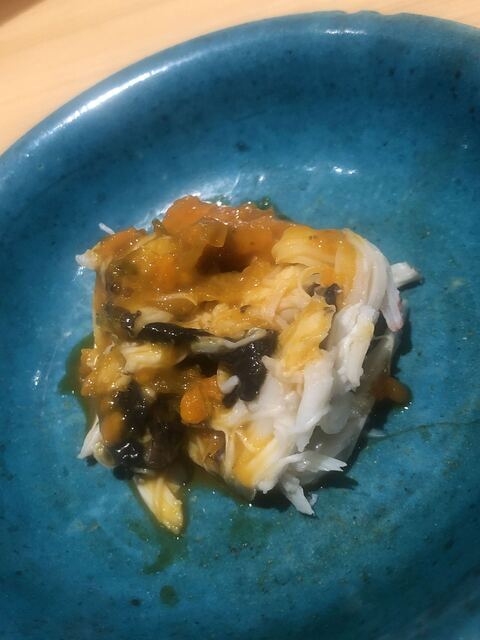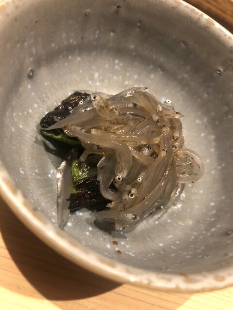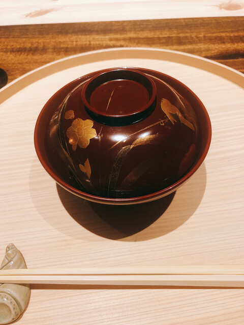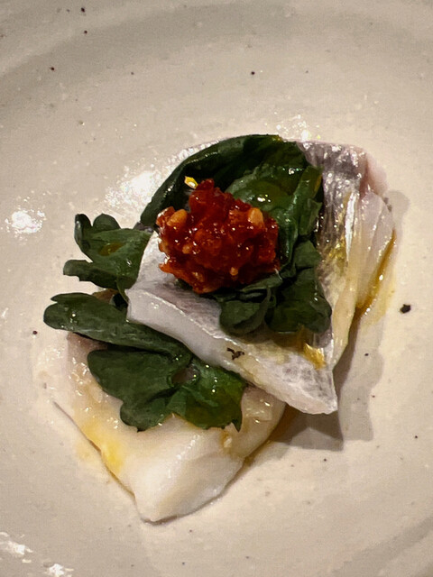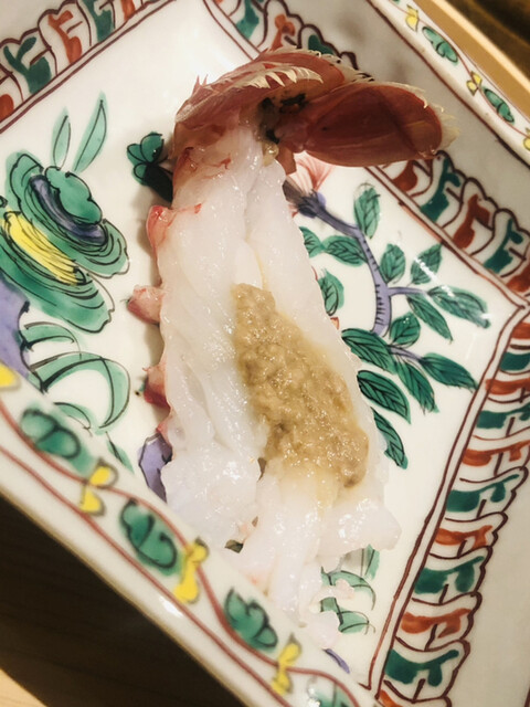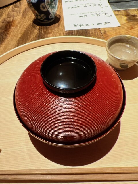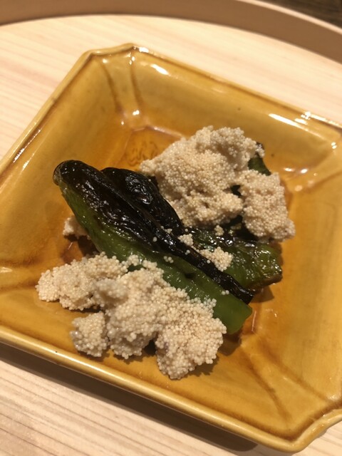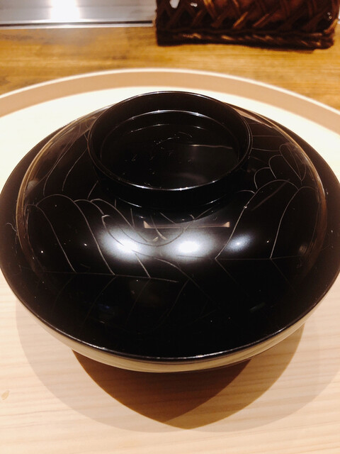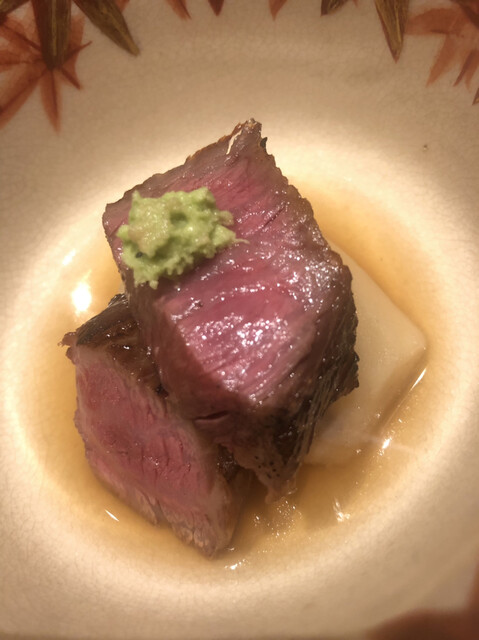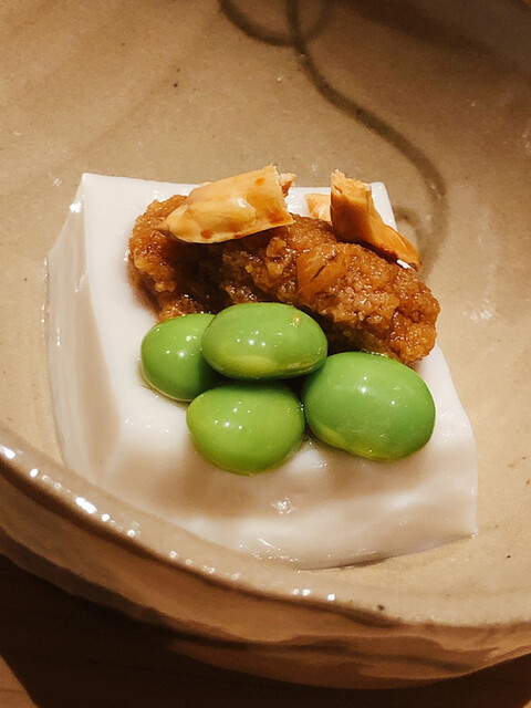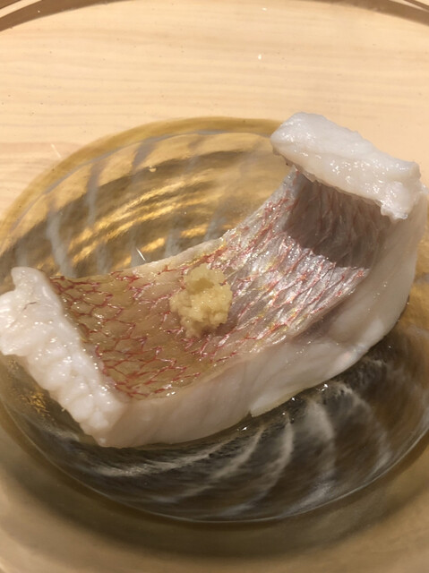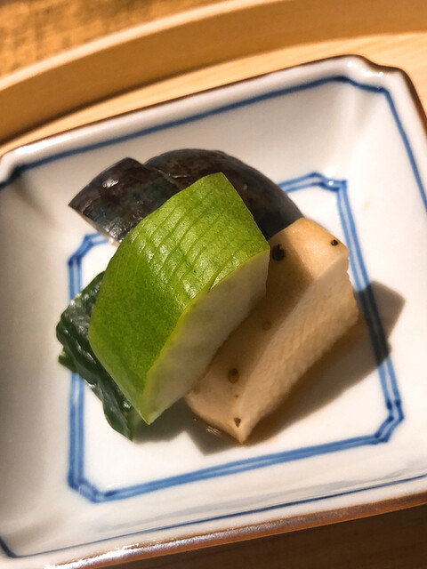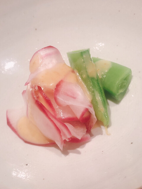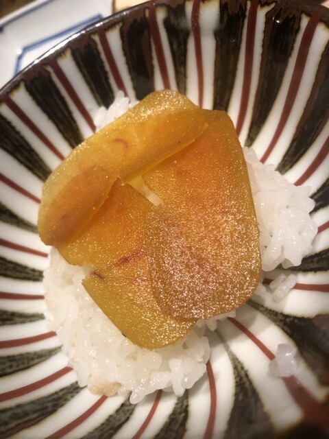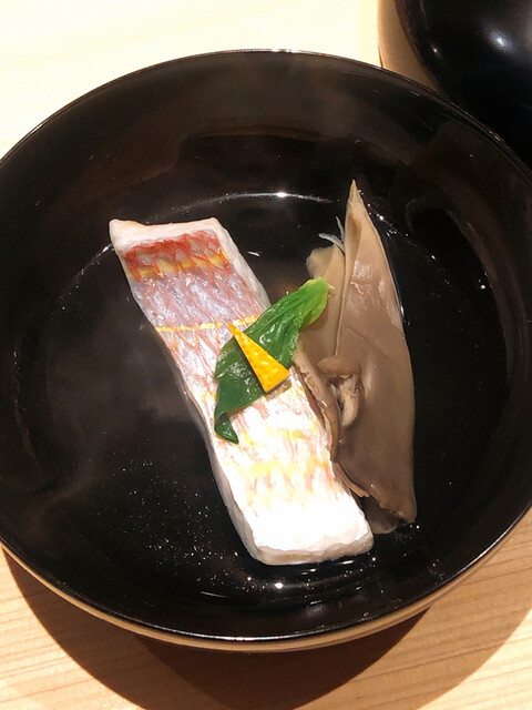 静岡県の奥山から届いた自然薯を卵白とともに蒸して、生唐墨の塩味でいただきます。でもそれだけでは有りません。その自然薯の皮を炭火で焼いて、深山の土の香りを添加しました。お出汁の旨味が静かに寄り添い、ワガママな舌も胃も歓喜の波に飲み込まれました。完全無比のスターターです。
