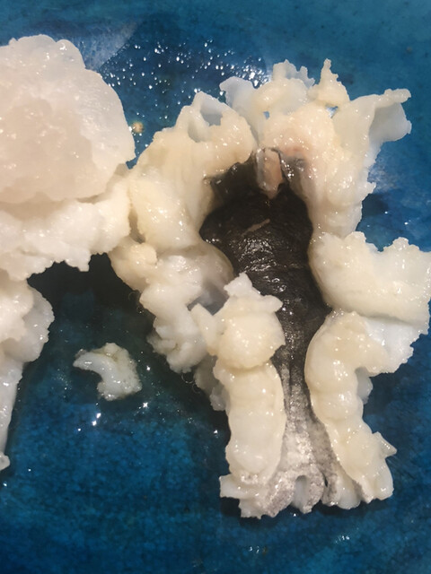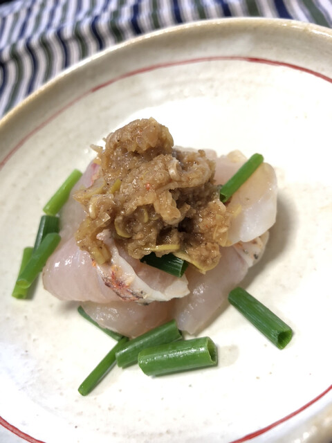 島根から静岡の市場に届いた鮟肝。サスエ前田さんのお眼鏡にかない、低温でじっくり蒸し上げ、紅葉おろしと小葱のポン酢でいただきます。まさにシルキータッチ!
