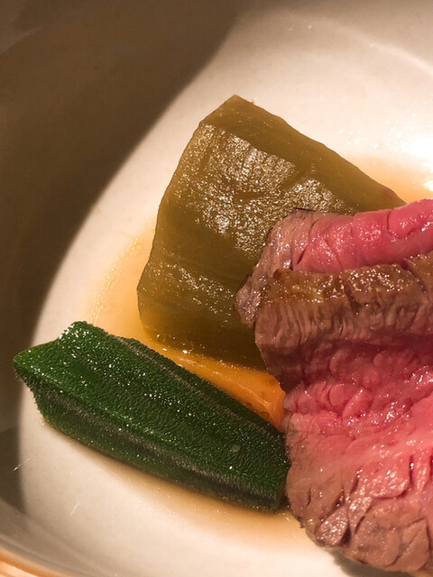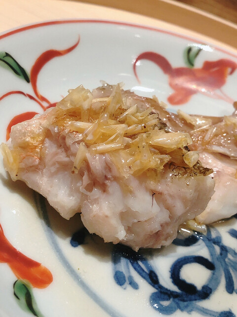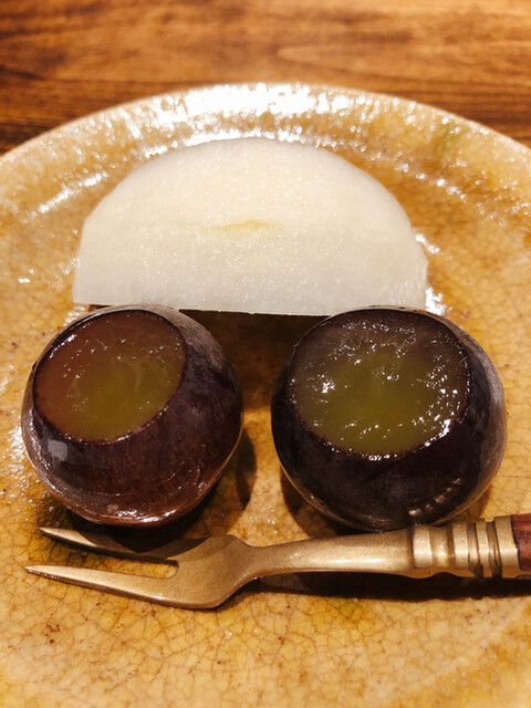 白甘鯛です。昆布と節系のお出汁の旨味に葛打ちしたツルッツルの白甘食感、焼茄子の香ばしさと黄柚子の爽快な香りでいただきます