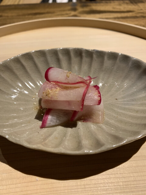 鰆。 これがヤバい(^^) 皮目をほんのり炙って引き出した旨みが、MAX! しかも、それがなんとも上品なこと。 杉山さんが「出回らない」とおっしゃるように、もう鰆と思えない美味しさ♪ 玉ねぎも超合う。