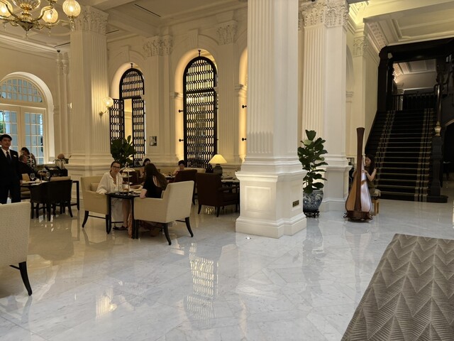 ロビーは大理石の床に白い柱が立ち並び、キラキラのシャンデリアでまさにザ・グランドロビーと呼ぶにふさわしい場所ですが、店内らしき場所は早い時間の予約だけかもしれません。私は2時過ぎに予約していて遅めのゲストはほぼ店外のロビー。店内的なところは早々に片付けられているようでした。