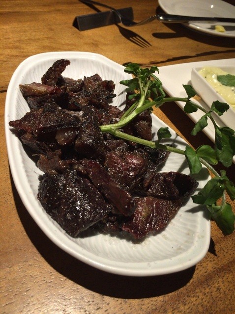 するとお店から特別の肉ブロックの端を切り落としたところを炭火で炙ったものをいただきましたが、これがまた美味であります。