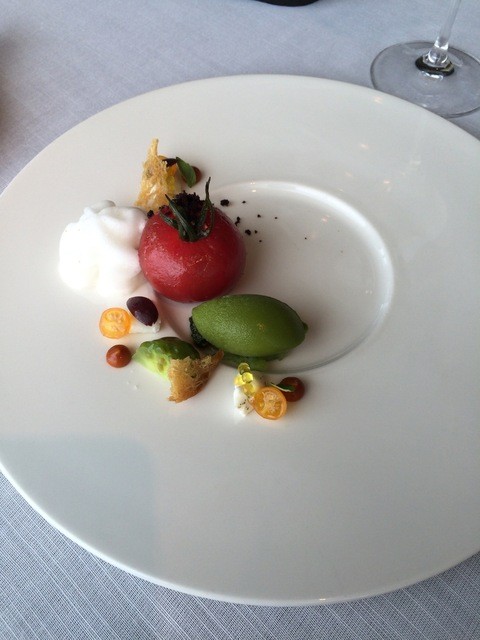 カプレーゼを分子料理的に解釈している品で、バジルはシャーベット状にして雑味を除いています。