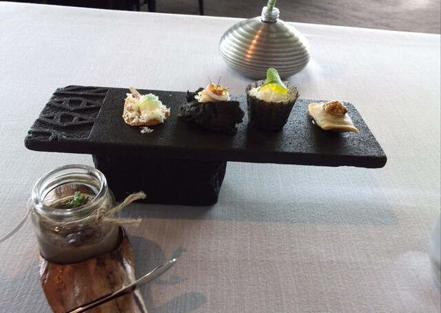 シェフの故郷英国•DEVON州の旗をアミューズに翳し、堂々とした料理が並ぶ。