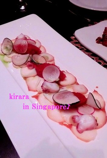 こちらは友人オーダーのタコのカルパッチョ・・・ ブラックラディッシュ、スモークパプリカが散らされ、レモンを効かせたサッパリとしたオードブル。