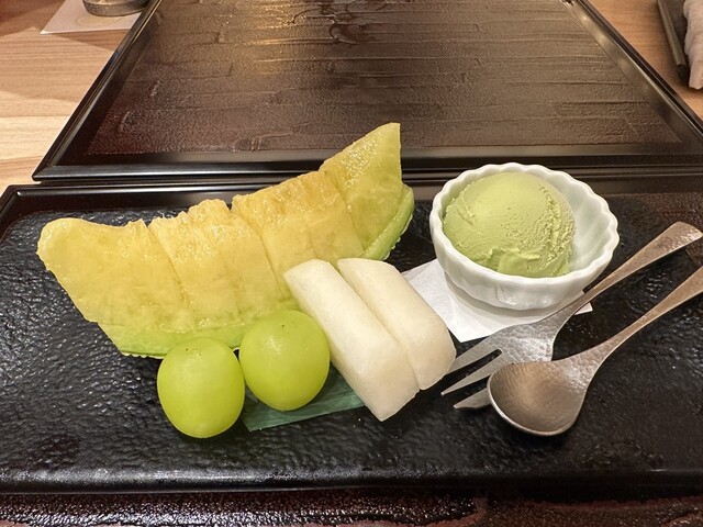 デザートはマスクメロン、シャインマスカット、梨、抹茶アイスと充実した内容。