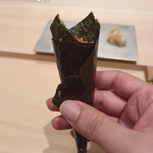胡麻、花穂紫蘇、白髪葱、山葵と一緒に巻かれます。