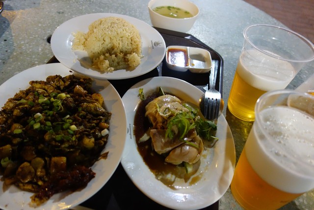 Wee Nam Keeが出店していました。東京の支店でとにかくガッカリしたことは記憶に新しいですが、本場はまた違う趣があるのだろうと期待して。こんもりと盛られたチキン。自然体で清澄な味わい。量も多く食べごたえがあります。主役はライス。たっぷりのスープで炊かれたゴハンは鶏の旨味を良いとこ取り。鶏肉そのものよりも鶏の味が濃いライスに思わず恵比須顔。スープもライスに負けず劣らず鶏が強い。そして何より嬉しいのが価格。このチキンライスのセットは400円弱なんです。これはお買い得!東京店の2,000円近くするチキンライスは何だったんだ。「しょうがないよ。だってこっちで一風堂食べると2,000円近くするもん」なるほど地理的アノマリーここにあり。