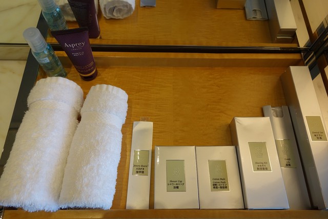 アメニティたち。リッツのクラブフロアのアメニティはアスプレイで統一されています。アスプレイは1781年創業のイギリス王室御用達ラグジュアリーブランド。映画『タイタニック』の「碧洋のハート」や『マリー・アントワネットの首飾り』のジュエリーを作ったブランドです。トイレは普通です。ウォシュレットは無し。ライティングデスク。これは仕事が捗りそうだ。大企業のお偉いさんが高層階に執務室をつくりたがる理由が少しだけわかりました。