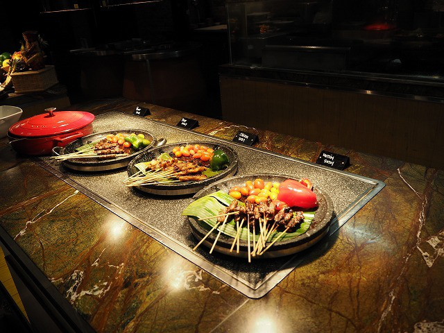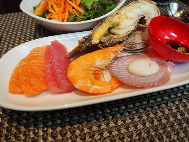 旦那は最初にシーフードを中心にもらってきました。最初からロブスターを一尾分・・・贅沢なランチです。妻もシーフードを中心に。和食のお刺身コーナーには、マグロとサーモンがありましたので、わさび醤油でいただきました。海外とは思えないお刺身のレベルに少々驚きました。握りにしてもらってもいいなと思うネタ、そのほかのシーフードも薄味で◎。美味しいです。ローカル料理のバクテー、炒飯、フライドホッケンミーなどをお味見。ホーカーズ巡りができるのはブッフェならではです。マレー料理、インド料理を中心に。ナシレマック、サテ、サモサ、ビリヤニ・・・種類の多さには目を見張ります。