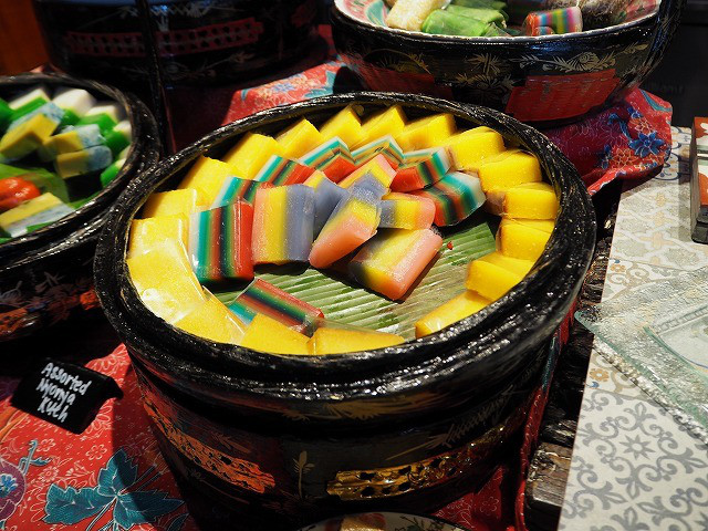 一番種類が多かったのは、プラナカンのデザート類でした。ピーナッツの砕いたものをまぶしたお餅です。ほんのり甘い味の付いたお餅にたっぷりピーナツを付けていやだきます。バームクーヘンのようなお菓子「KuehLapis(クエ・ラピス)」です。1枚1枚焼いて9層を張り付けたもの、Lapis(ラピス)はマレー語で「層」という意味だそうです。ういろう風のカラフルなお餅を重ねたお菓子「LapisSagu(ラピス・サグ)」です。これも正式には9層で作るもの。甘さ控えめな点も、もっちりした食感という点でもういろうそのものです。こんなにカラフルなお餅ものもあります。