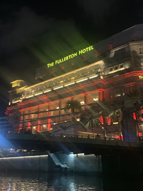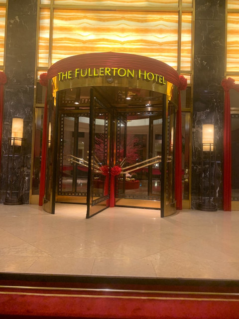 空港からタクシーでマーライオン公園の近くにあるフラートンホテルへ。いつもは黄色いライトアップだが正月仕様で赤いライトアップ。元々郵便局だった歴史的建造物をリノベーションしてホテルにしたもの。