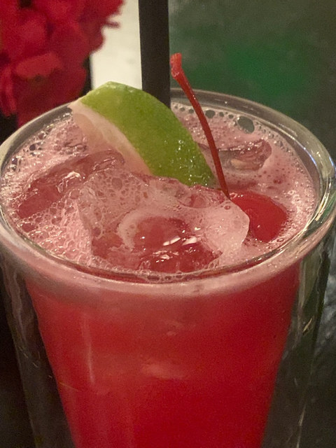 何か上げ底感のあるシグネーチャーカクテル、マーライオンカクテル。よく見るとグラスの底にマーライオンが見える。普通はテキーラが入っているらしいが、ノンアルコールで作ってもらった。ラッフルズのシンガポールスリングの2番煎じ感は否めない。