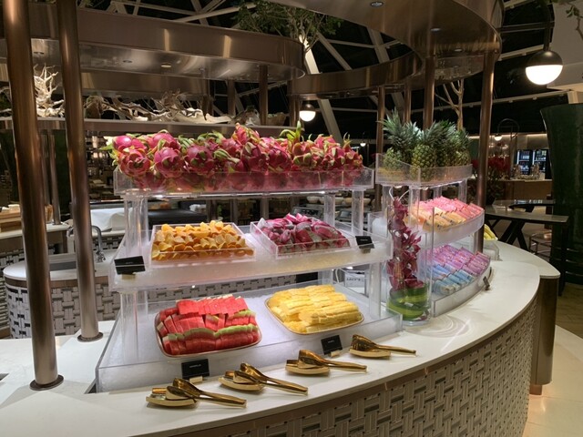 マリーナベイサンズの1階に位置するオールデイダイニング。週末、朝食ビュッフェを利用。ホテル宿泊客以外も利用可。2024年3月時点で税サ込S$62.35(7,000円相当)。