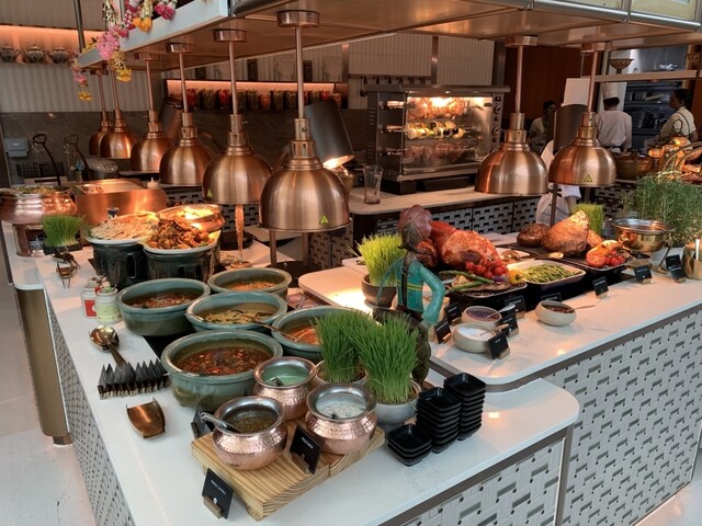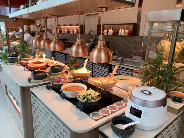朝食ビュッフェを利用(宿泊客以外も利用可)。ラインナップが豊富で地域色豊か。税サ込S$62.35(7,000円相当)はサンズにしては手頃価格。