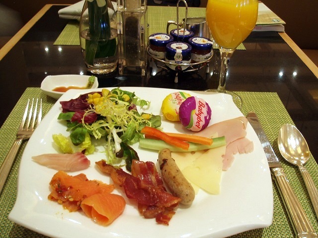 サラダとコールドメニューを中心に。妻は、野菜に、サーモン、ハムなどをいただいてきました。旦那は、ベーコン、ソーセージ、スモークサーモン、そしてチーズと、ボリュームが多めです。フルーツも一通りいただいてみましたが、思った以上に甘くてびっくり。