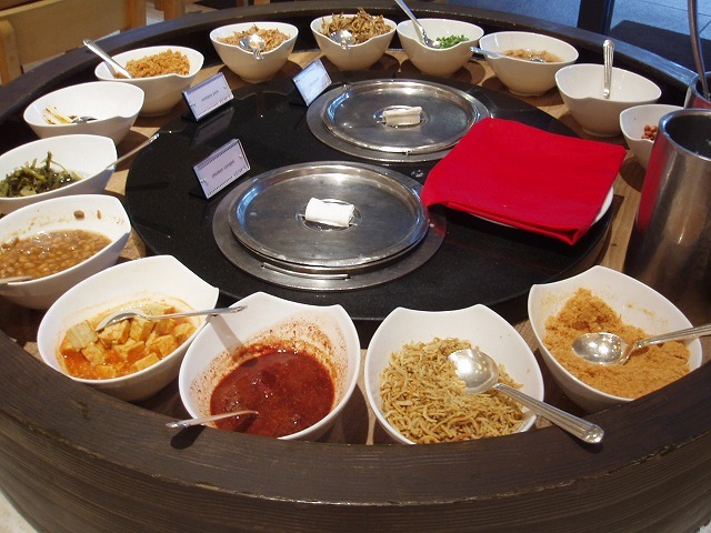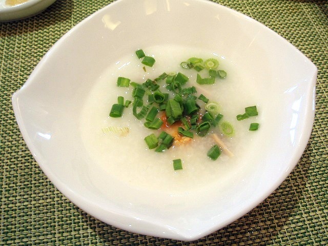 丸い筒状の台には・・・これ、お粥ステーションでした。中央には、プレーンと鶏肉の2種類のお粥鍋があり、周囲には、お粥のトッピングが並んでいました。ピーナツ、揚げ玉ねぎ、じゃこ、腐乳、ネギ等々、中国やマレーシアでみられるお粥の友。