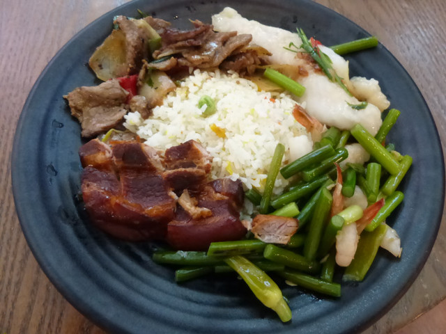 チャーハン3S$に4S$の肉料理を2種類、4S$のシーフード料理を2種類