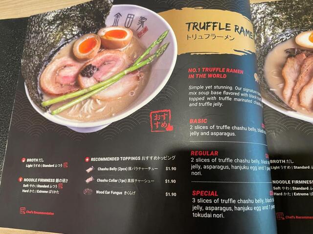 他にもラーメンの種類はありましたが、最初に開いたページにTruff Ramen(トリュフラーメン)とKotteri Tonkotsu Ramen(こってり豚骨ラーメン)が載っていました。さすがに初訪問でトリュフは無いかなぁ・・・ということで半熟玉子が入ったKotteri Tonkotsu RamenのRegular, SGD16.90(税サ込SGD20.08)をオーダー。