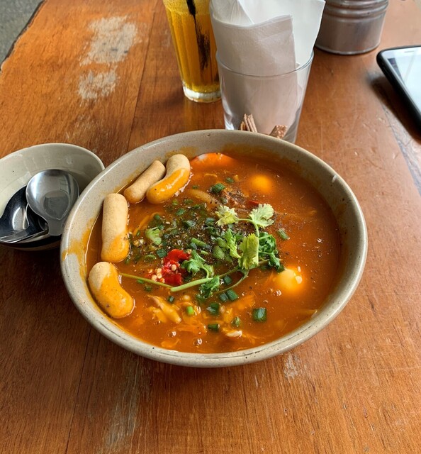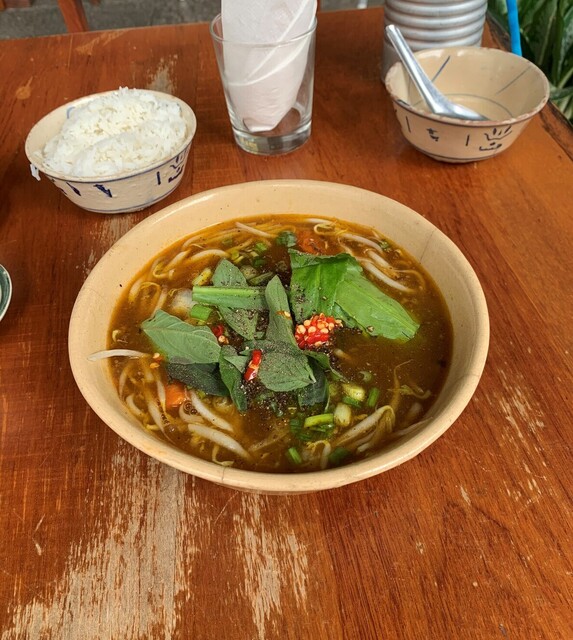 蟹で出汁をとったトマトベースっぽいスープに太くて短いライスヌードルを合わせたお料理。具は蟹身、豚肉、エビが入ります。スープに入る名前も分からぬ香草類がいい仕事しています。