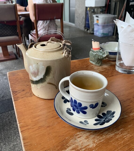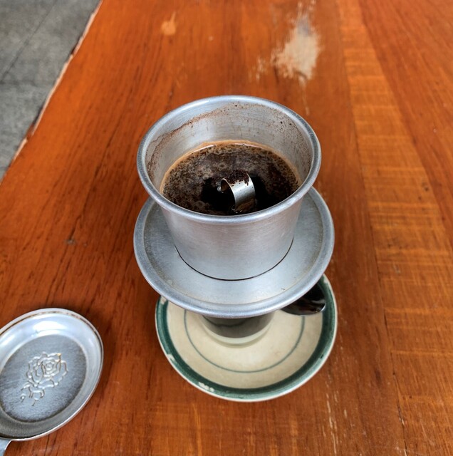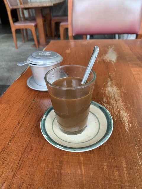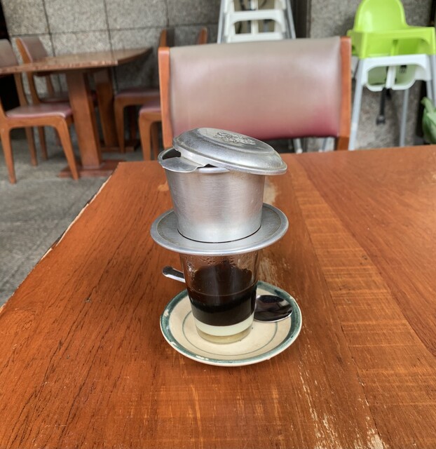 ドリップ用の器と共に運ばれてきたコーヒーはまだポトリポトリとドリップ中。コーヒーが下のカップに全て落ちるのを待ってからいただきます。コンデンスミルクたっぷりで甘め。ちょっと量が少ない...。