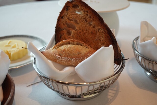続く「コンテチーズとビアンド・デ・グリゾン」は、若いチーズのミルキーさにスイスの干し肉の塩味が寄り添い、バランスのいいひと口サイズ。自家製のミニクロワッサンは小ぶりながら香りが立ち、層の重なりも美しく、バターの余韻がほどよく広がる。