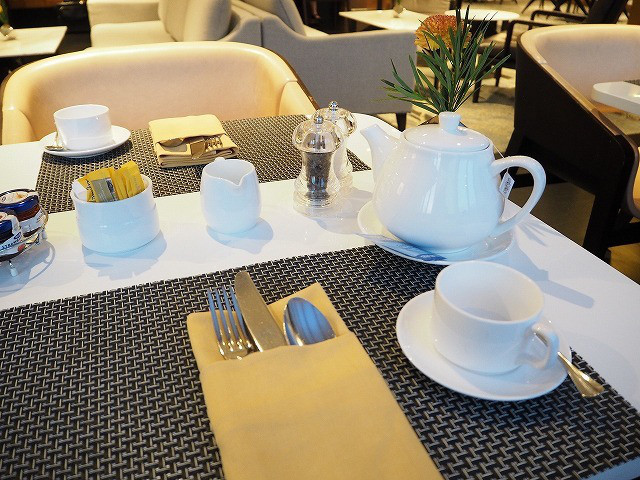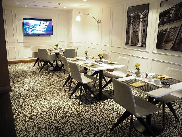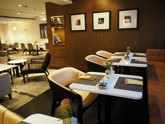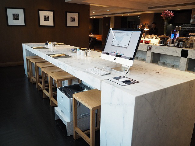 ラウンジは上層階にあります。エレベータを降りると、エグゼクティブラウンジのレセプションがあります。こちらにスタッフが常駐し、チェックイン、チェックアウト手続きができるほか、コンシェルジュとしての役割も果たしています。ラウンジは早朝から夜まで利用でき、朝食、アフタヌーンティ、カクテルタイムサービスがあります。食事の時間以外でもソフトドリンクは終日サービスされています。