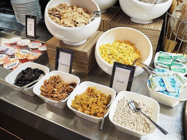 シリアル類も4種類。普通のコーンフレークに加え、玄米フレーク、ブラン、グラノーラがあり、ナッツやプルーン、レーズンもあります。